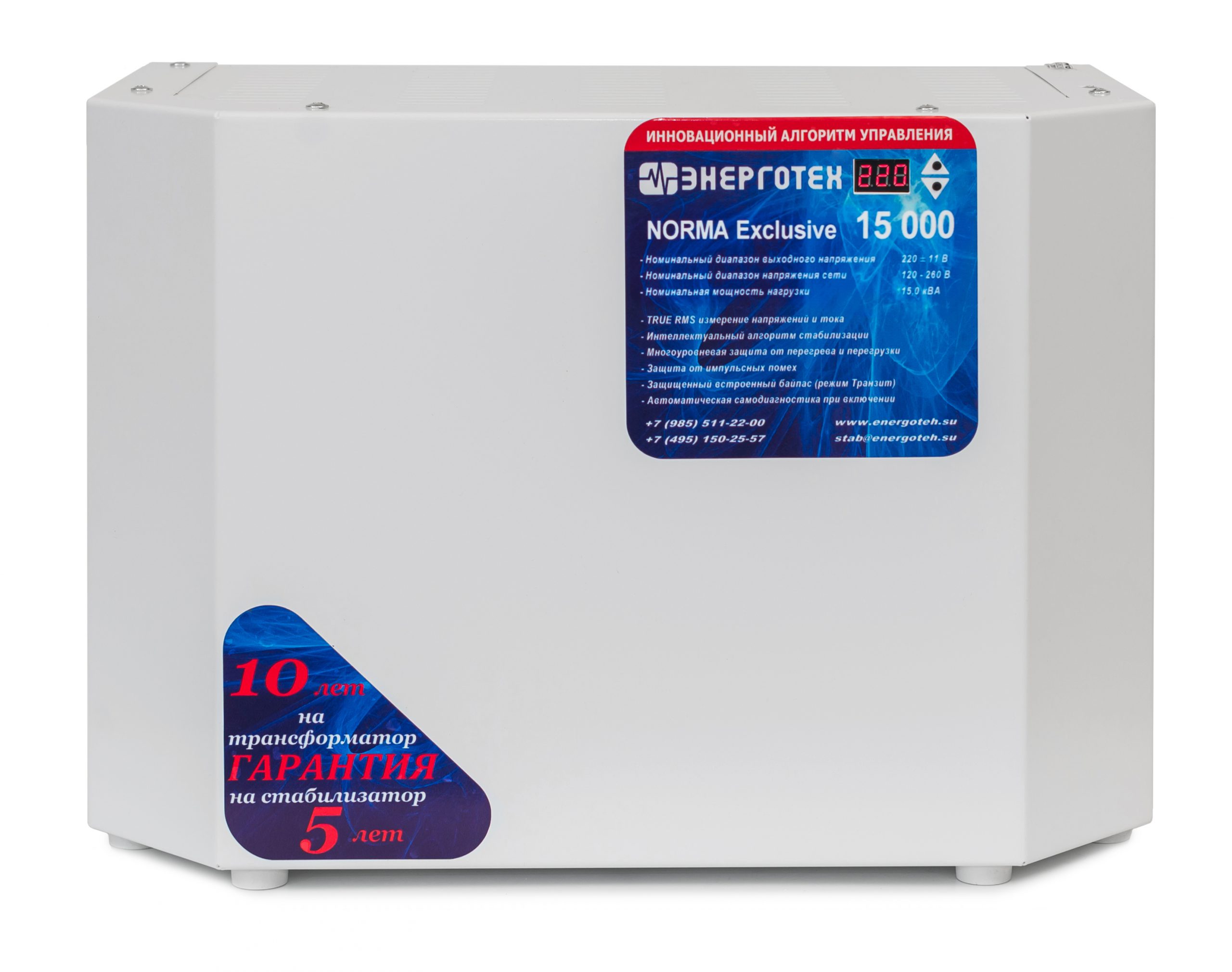 Серия NORMA EXCLUSIVEСтабилизаторы напряжения NORMA EXCLUSIVE обеспечивают точность стабилизации ± 6% и доступны в диапазоне мощностей от 5 до 20 кВА. Оснащены увеличенным числом ступеней регулирования (12 ступеней) и предназначены для защиты бытовой техники со средними требованиями к качеству питания и точности стабилизации напряжения. Рекомендованы к установке в жилых домах, на дачах, в квартирах, небольших магазинах и кафе. Преимущества серии NORMA EXCLUSIVE:- защита от перегрева, короткого замыкания и перегрузок,